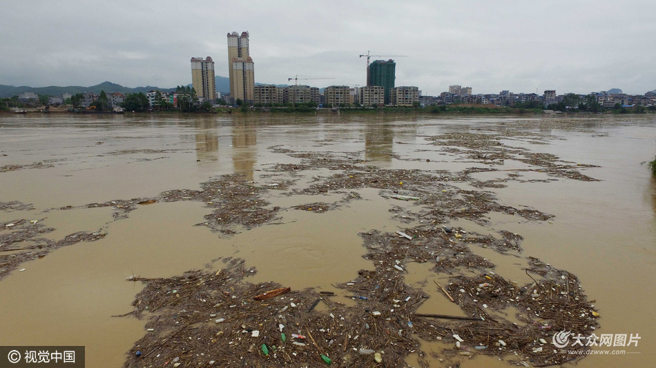 2016年06月04日,廣西柳州,融江水位開始回落,暴雨過后,從上游漂浮大量樹枝、樹葉、塑料袋、飲料瓶等垃圾,在江面上形成一條長(zhǎng)長(zhǎng)的垃圾漂浮帶。