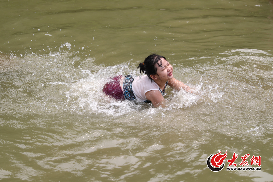7月4日,山東濟南,兒童在在泉水浴場旁的沙灘區跳水消暑。當日,山東省氣象臺繼續發布高溫黃色預警信號,今明兩天最高溫35度。天下第一泉景區內的泉水浴場已為市民恢復開放,泉水浴場成為市民納涼消暑的第一選擇。大眾網記者 王長坤 攝