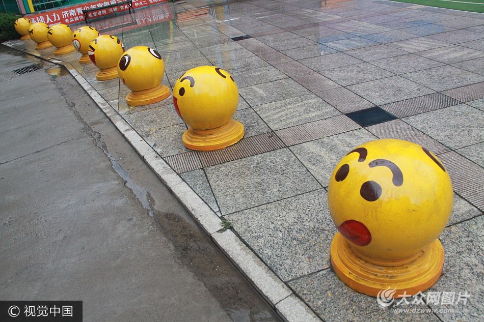 2017年7月6日,在濟南少年路附近,近百石墩涂抹成QQ版表情包排隊,十分吸引眼球。原本不起眼的石墩,搖身一變成了真實版QQ表情,給泉城市民帶來一絲喜悅。