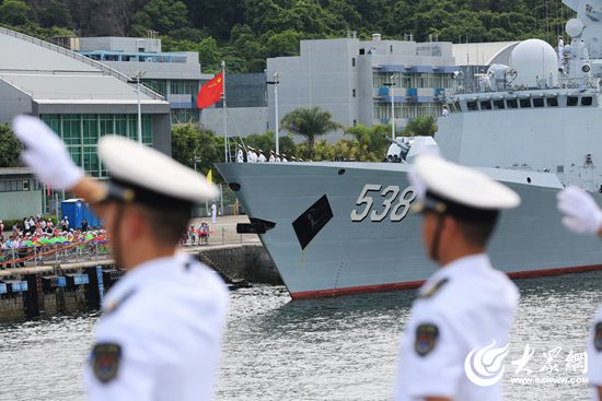 大眾網青島7月7日訊(通訊員 張剛 張凱)7月7日上午,正在執行跨區機動訓練任務的中國人民解放軍海軍航母編隊抵達香港,參加香港回歸祖國暨中國人民解放軍進駐香港二十周年慶祝活動,受到香港特區政府和民眾熱烈歡迎。香港特區政府在昂船洲軍營舉行隆重歡迎儀式,行政長官林鄭月娥率特別行政區政府主要官員出席儀式。全國政協副主席董建華出席歡迎儀式,登上導彈驅逐艦銀川艦參觀,并檢閱該艦儀仗隊。