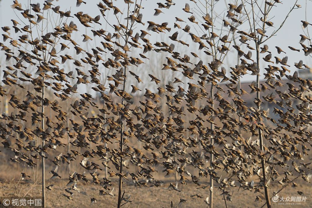 1月5日,在山東青島市膠州灣濕地上,上萬只麻雀為躲避老鷹襲擊集結成密集的鳥群,集體覓食或飛舞,以弄亂老鷹的視線進而避免成為老鷹的食物。