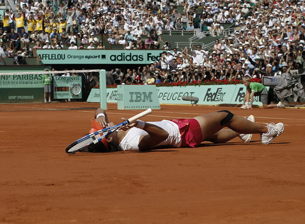 奪冠之后,李娜把自己“扔”在紅土場上,任由汗水活著紅土變成泥水,忘情地躺在那慶祝。