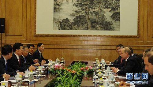 普京表示,俄中合作潛力巨大、前景廣闊。俄方對實現雙邊貿易額2015年達到1000億美元、2020年達到2000億美元的目標有信心。俄方希望同中方加強協商,積極規劃,大力推進有關重點合作項目,深化油氣、能源、核能、電力、新能源、林業、環保等領域合作,開展聯合科技研發,改善經貿合作結構,提升合作水平。俄方愿同中方加強軍事及執法安全合作,促進人文、新聞、旅游交流,支持俄遠東西伯利亞地區和中國東北地區進行合作。